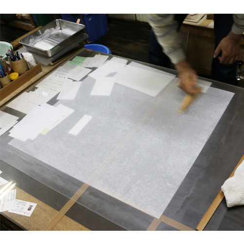 裏打ちとは「作品に薄い紙を貼る事で、作品の皺を伸ばし、又、紙を厚くすることで強度を持たせる技法です。」