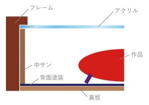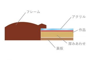 軽く割れにくく、ガラスよりも透明度や、紫外線カットの面で優れています。ただし、ガラスよりも高価で、強く擦ると傷が付いてしまいます。また、静電気を帯びやすく、表面にホコリが付きやすいため、作品の出し入れ時や、拭き掃除は慎重に行う必要があります。