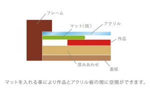 マットをダストカバー(アクリル・ガラス)作品の間に挟むことにより、直接作品がダストカバーに触れることを防ぎます。特に油絵具、銀塩写真など直接ダストカバー(アクリル・ガラス)が触れてしまうと、塗料がダストカバー(アクリル・ガラス)に付着してしまい、取り外すことが難しくなる可能性がございます。又、湿気の寒暖差の影響でダストカバー(特にガラス)内側に水滴が付くことがあり、直接作品に触れてしまうと、作品へのカビの発生の原因になります。