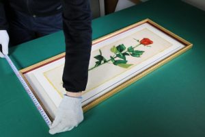なんてことにならないように、必ず実物をメジャーや定規で採寸しましょう。既製品額縁を選ぶ場合も、オーダーメイド額縁を注文する場合も必ず必要な情報になりますので、作品サイズは事前に測っておきましょう。実店舗で注文する場合は、お店のスタッフが採寸を行いますが、インターネット通販で注文する場合は、ご自身の責任で採寸を行わなければなりません。注文を確定する前に、再度サイズの確認をするぐらいの慎重さが必要です。