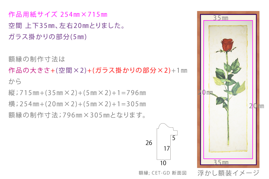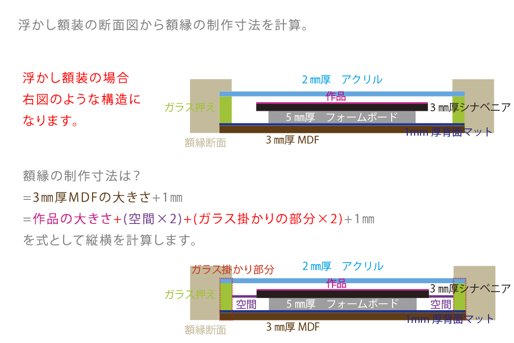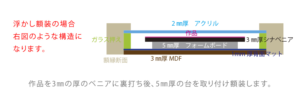 ※浮かし額装のサイズは作品サイズを元に額縁の縦、横、高さを決定します。マット額装に比べて作品の厚みを考慮する必要があるため注意が必要です。 ご不安なお客様はお気軽にお問合せ下さい。