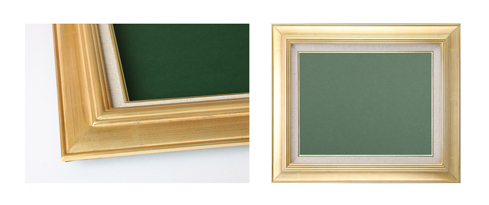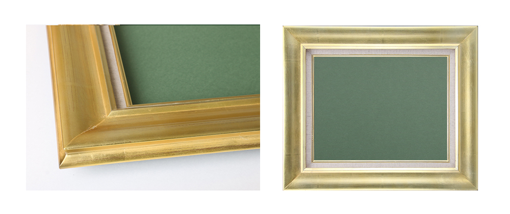 Y-10ゴールドは製品の縁に枠が付いており、中心の油絵に視線が集まるデザインが特徴の油彩額です。シンプルな形状ですが明るい色合いのゴールドを使用しており、作品全体にも好印象を与えられます。