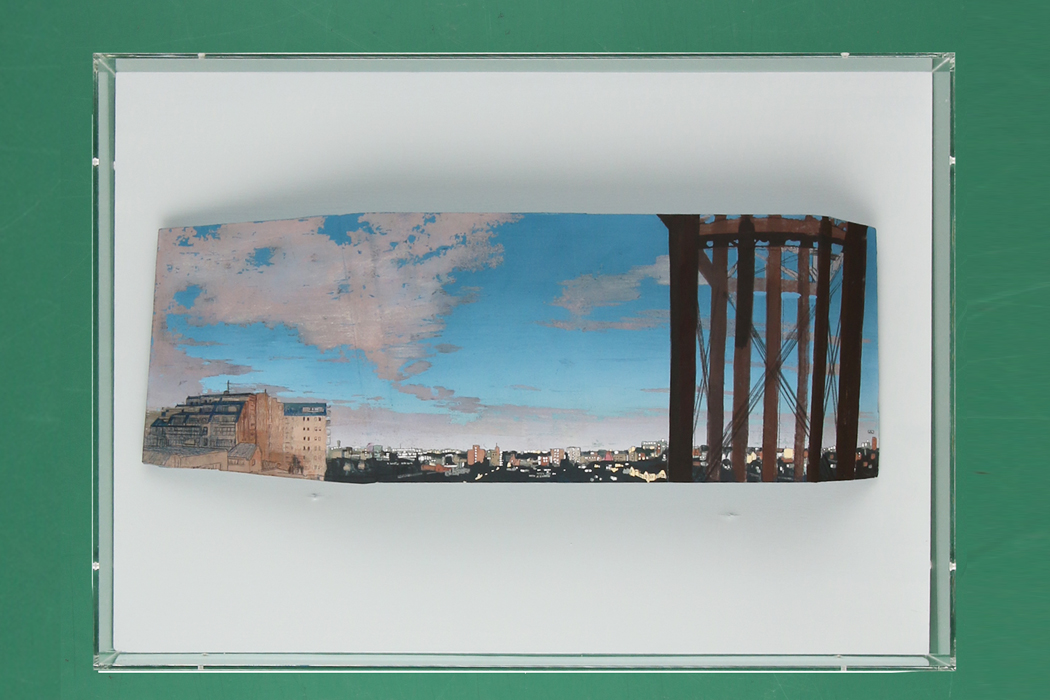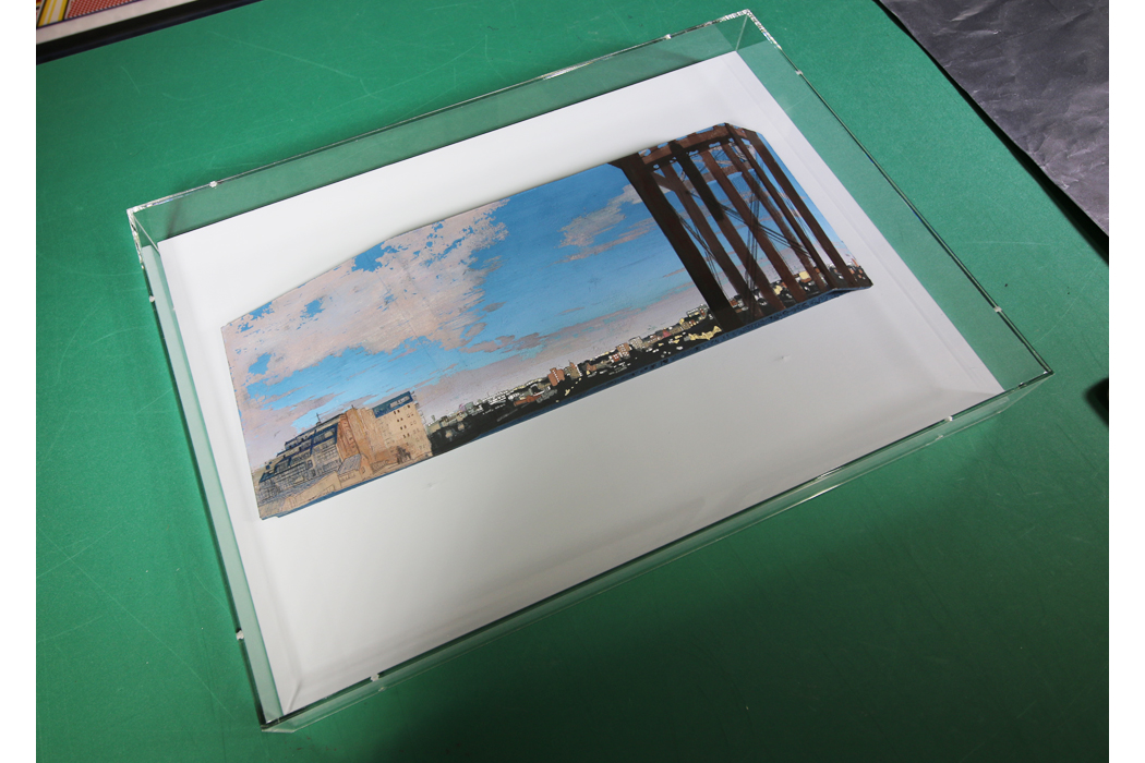 立体作品(主に木枠作品)の場合、額縁で額装をするとバランスが悪くなってしまう事があります。その場合は作品自体の雰囲気を残し、埃が作品につかないためにアクリルBOXを作品に取付ける事もできます。