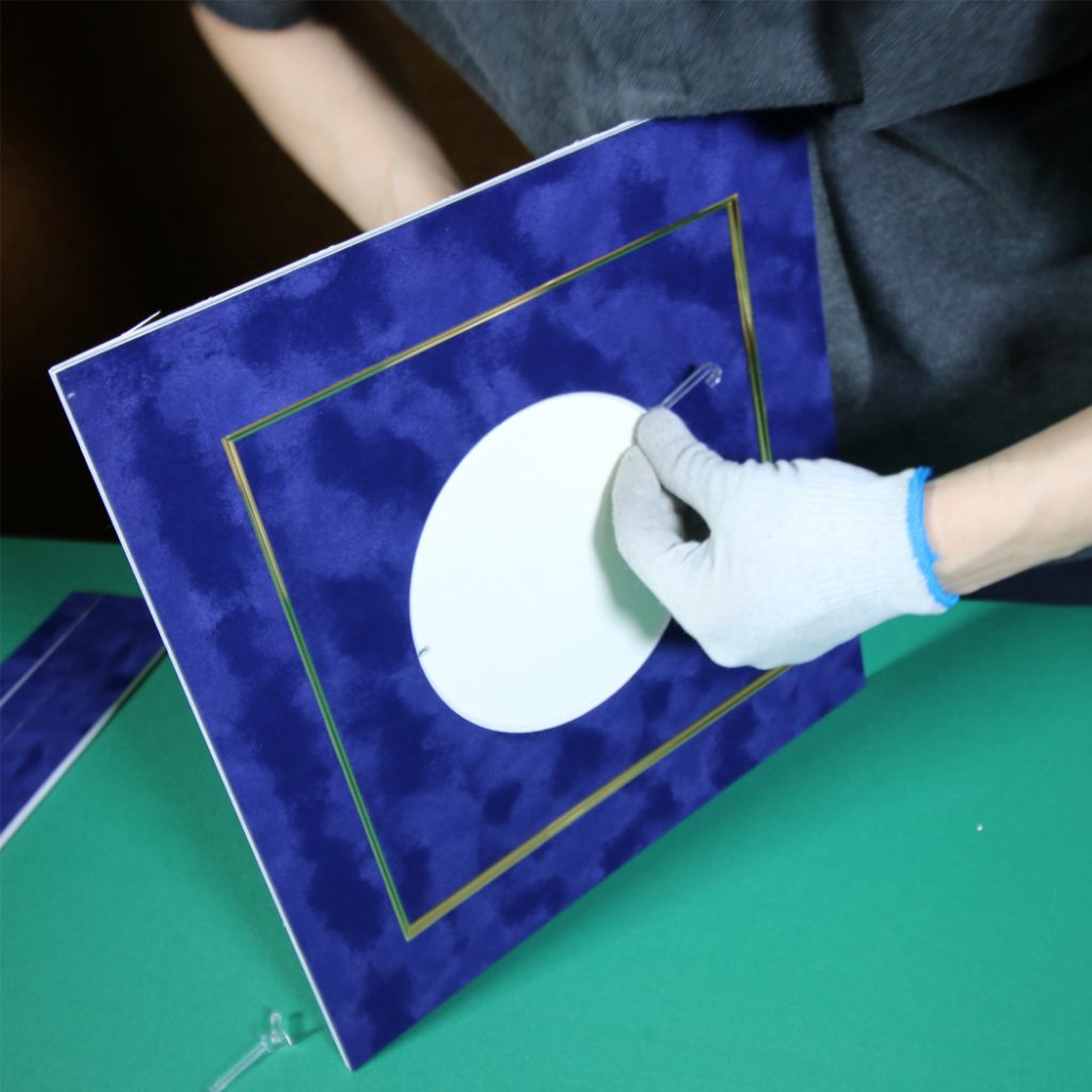 アクリル板を取り付けた額縁を作品の上から被せます。