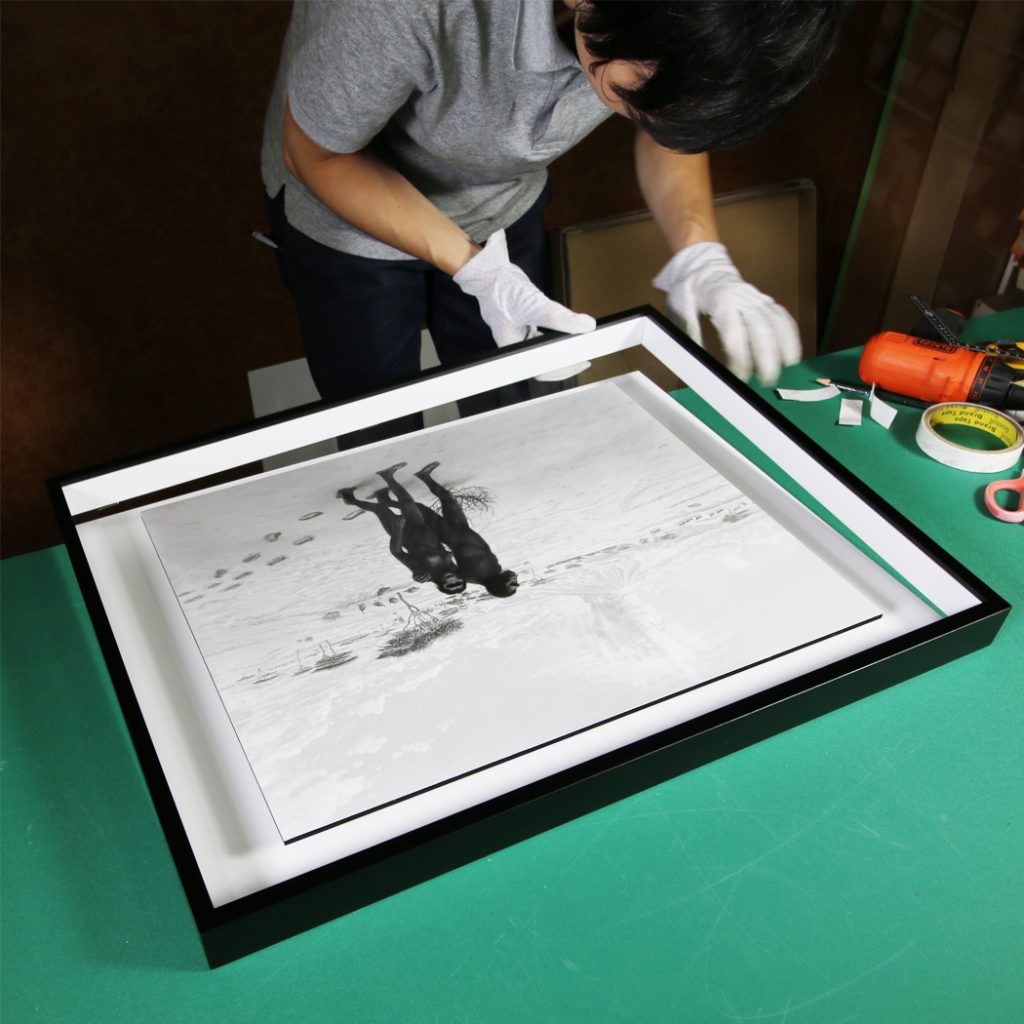 浮かし額装とは、作品を額縁の中で浮いているように見せる額装方法です。現代アートでよく使われる近代の額装方法です。