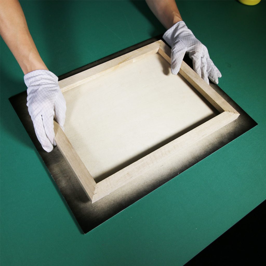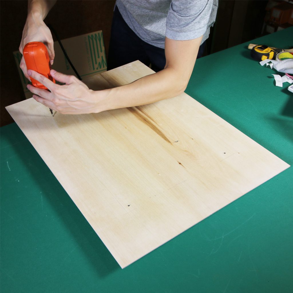 裏板を取り出し、作品を固定する位置を決めます。今回、裏板はホワイトで塗装をしております。