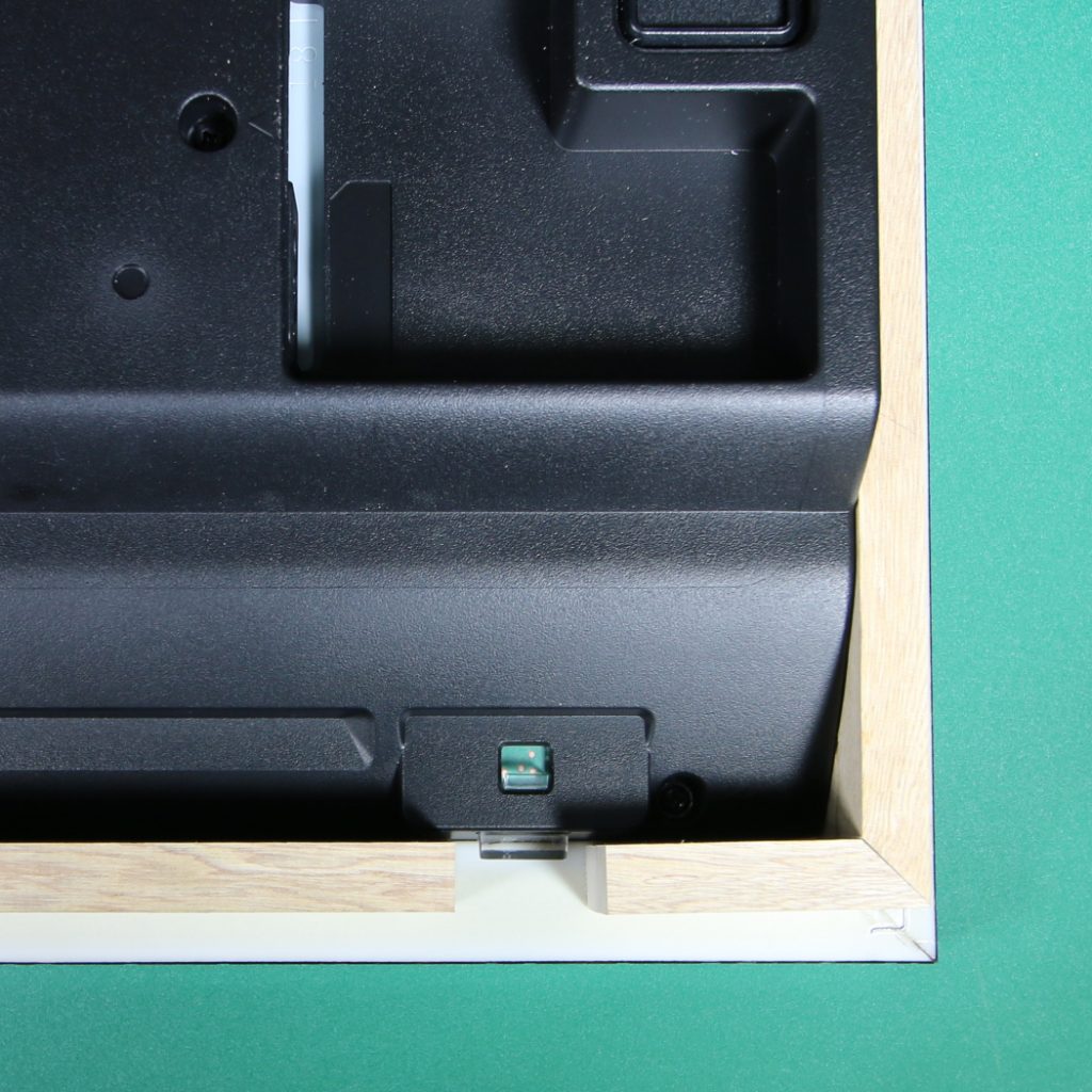 裏面。真ん中部分は、機械の熱を逃がすため、壁にモニターを取り付ける際のモニター専用の金具を取り付けるために開けております。