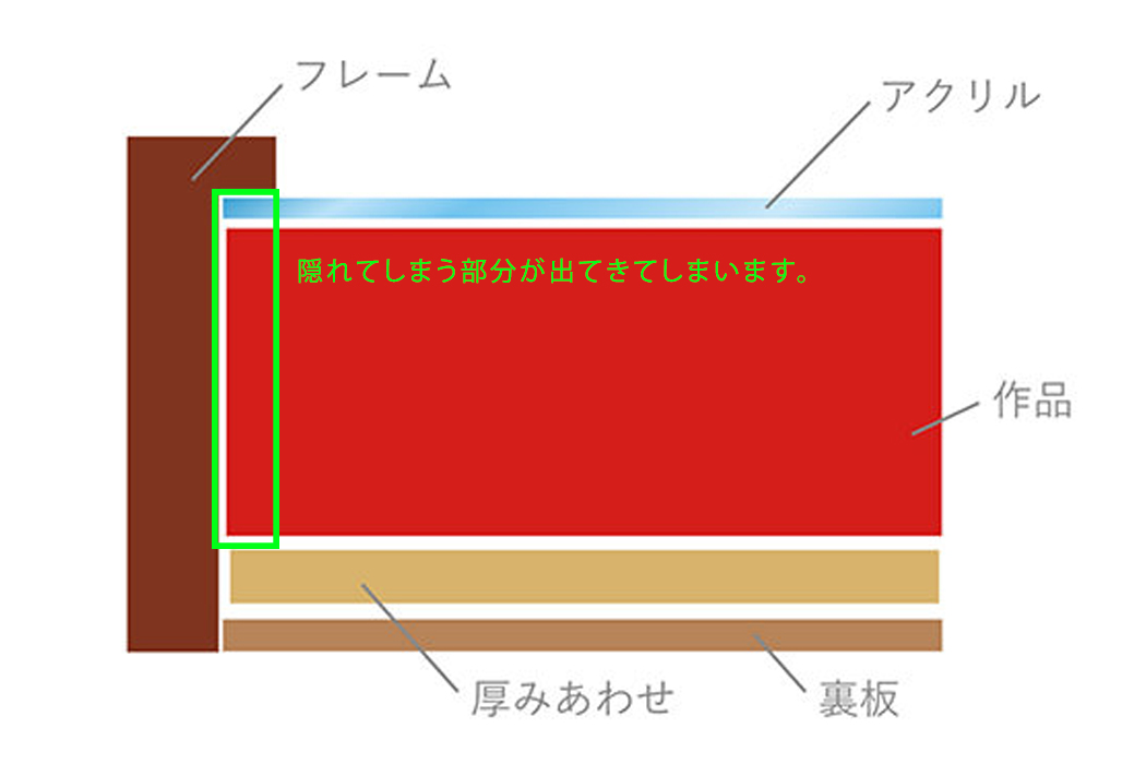 【注意】通常の額縁の額装ですと、作品周りが額縁のガラス掛かりに掛かって隠れてしまいます。