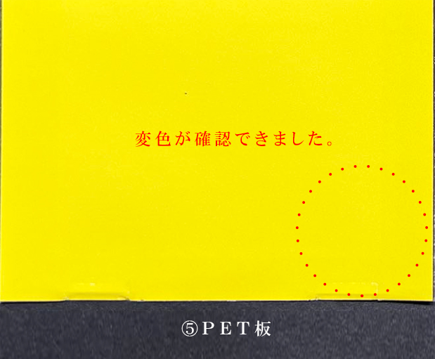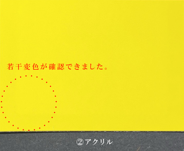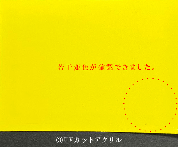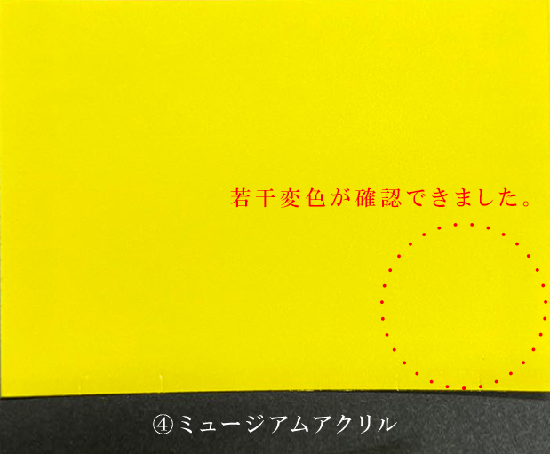 ・紫外線を受けて⑤PET板 > ②アクリル ≧ ③UVカットアクリル >④ミュージアムアクリル ≧ ①の順で板自体が黄色く変色していた。