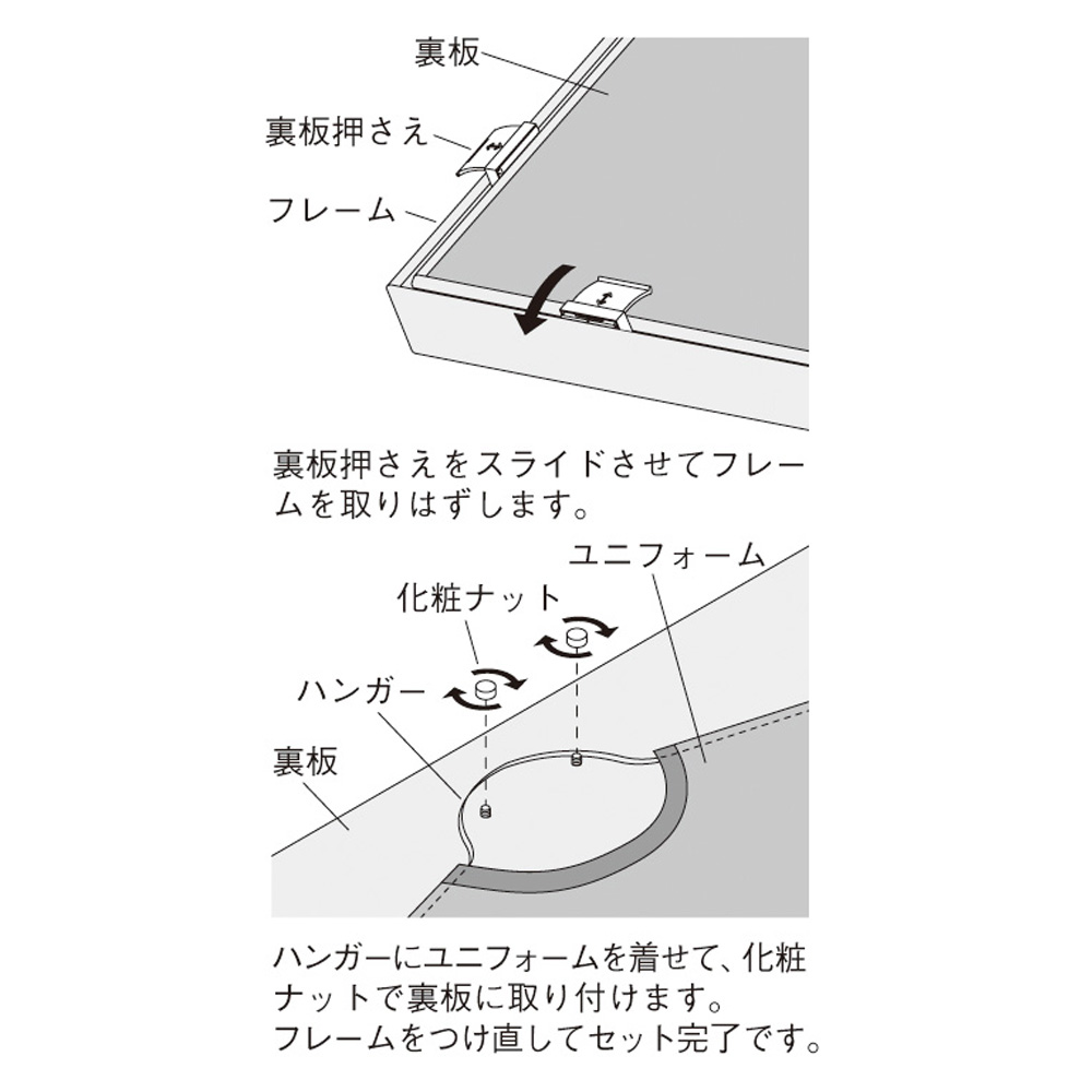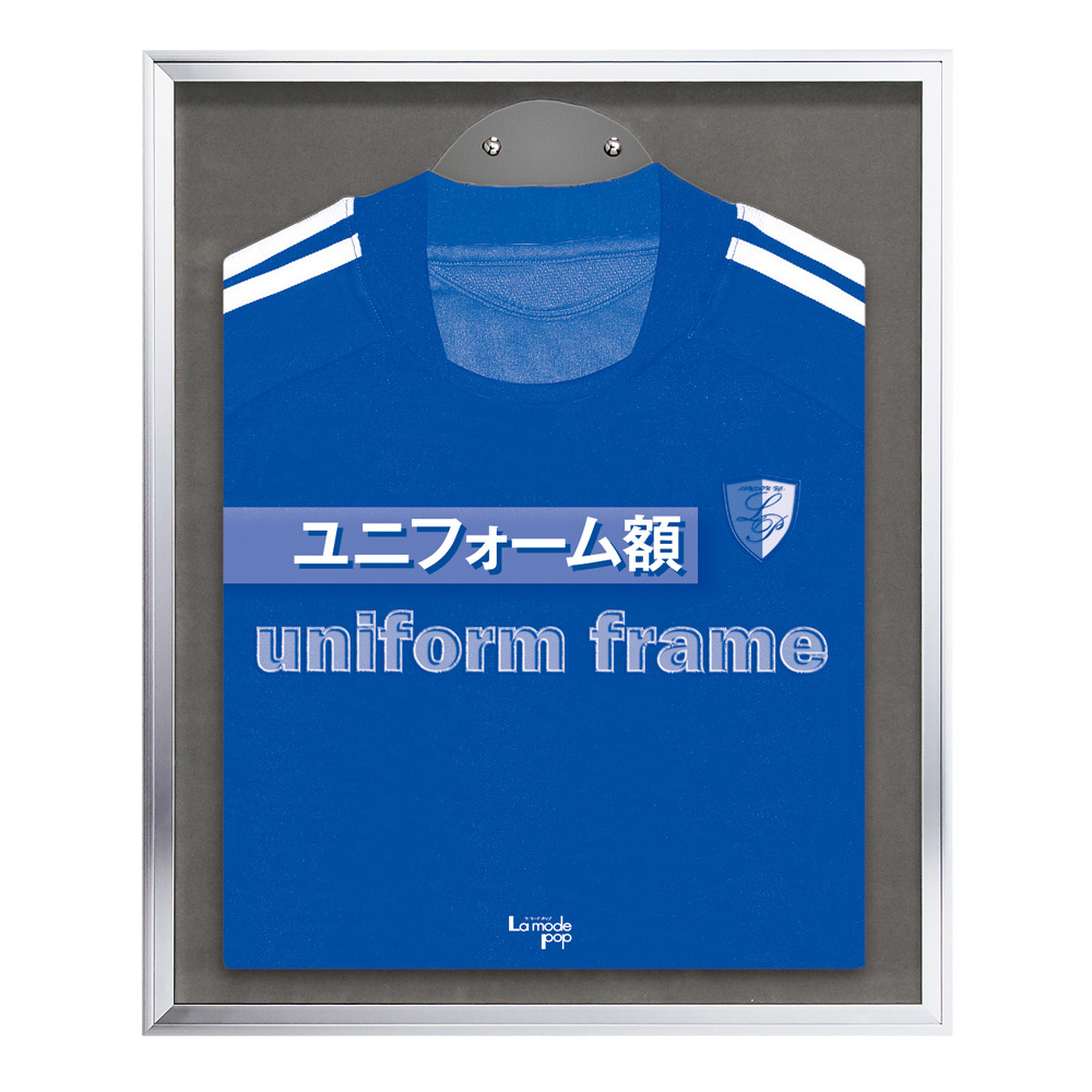 シンプルなユニフォーム額です。ユニフォームを折りたたんで額装をします。付属のエンビシートをユニホームに着せ、お客様ご自身でも比較的簡単に額装が可能です。ユニホームを折りたたんで額装をするため、飾るスペースも狭くなります。注意点は、折りたたんで額装をするため、サイン入りユニホームの場合はサインの位置が隠れないか確認が必要です。【付属品】折ハンガー Sサイズ:W350×H890mm(折りたたみ時H490mm) 透明クリップ 紐