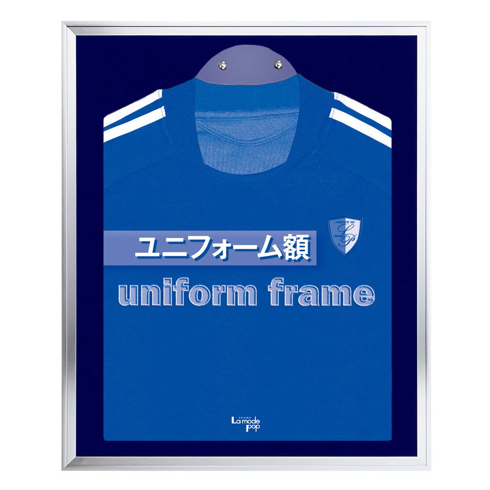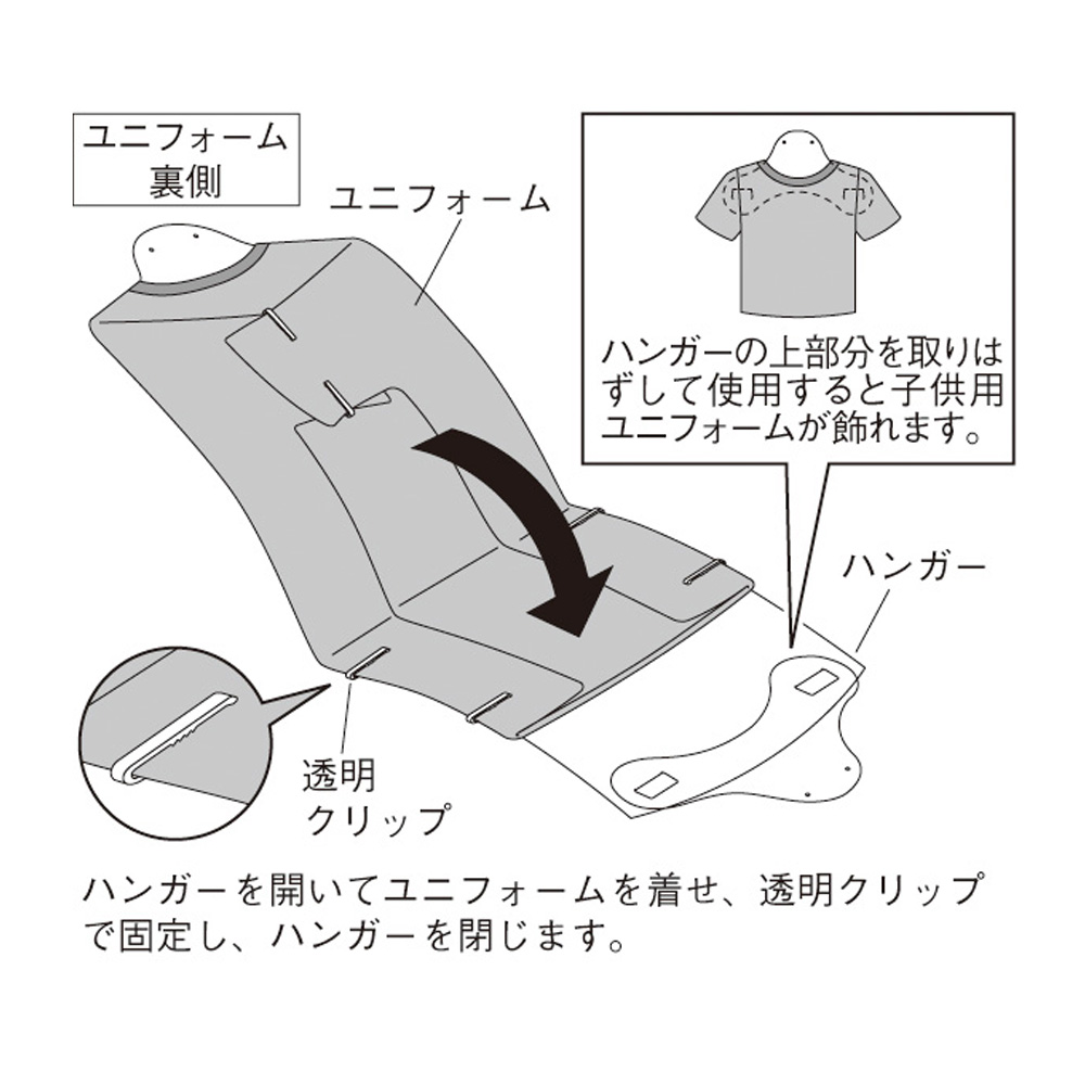 シンプルなユニフォーム額です。ユニフォームを折りたたんで額装をします。付属のエンビシートをユニホームに着せ、お客様ご自身でも比較的簡単に額装が可能です。ユニホームを折りたたんで額装をするため、飾るスペースも狭くなります。注意点は、折りたたんで額装をするため、サイン入りユニホームの場合はサインの位置が隠れないか確認が必要です。【付属品】折ハンガー Sサイズ:W350×H890mm(折りたたみ時H490mm) 透明クリップ 紐