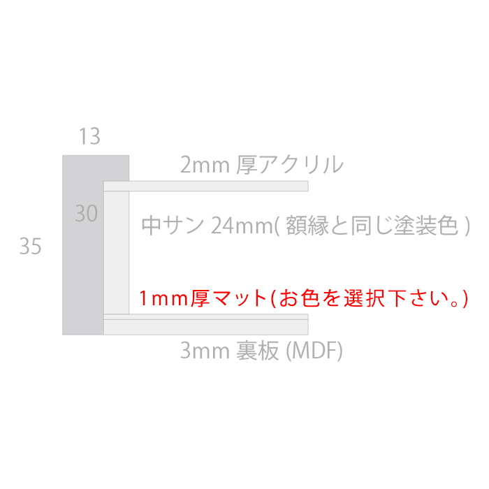 さくら平型 13mm幅 高さ35mmです。額縁自体の深さは30mmですが、アクリル板、裏板、通常1mm厚のマットを背面に入れるため、24mmまでの作品まで額装は可能です。浮かし額装で使用する場合は、アクリル板と作品との間に4?の空間は欲しいので厚さ20?までの作品とお考え下さい。この製品は1?厚のマット入りです。4色の中からお選びください。木製フレーム、サクラシリーズは全国の美術館や展示会で数多く使用されています。デザインもシンプルかつ高品質のため、作品をより一層際立たせます。非常に幅広くご利用頂けます。ご注文を受けてから、職人が一枚一枚塗装をし、セット、梱包をいたします。納期までに2週間程かかります。