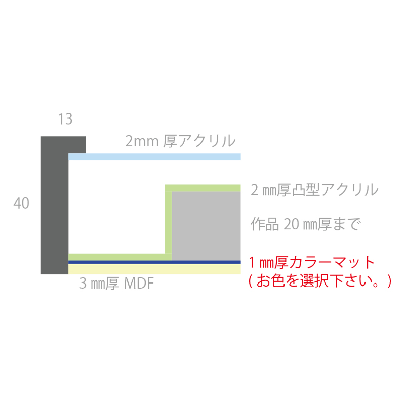 本を額装する際の額縁です。アクリル板を使い、本の大きさに合わせて凸加工致します。本にはサイン本、展示会カタログ等、額縁に収めるだけで作品となるものが数多くあります。弊社では本は印刷物なので、額縁はできるだけシンプルにしたご提案をさせて頂いております。さくらシリーズは職人が1枚1枚丁寧に組み上げ、塗装をするため、形状は非常にシンプルですが、非常に高級感がございます。カラーも12色ご用意しております。この製品は本の厚さが20?まで対応できます。ご注文後、弊社から本の大きさを確認させて頂きます。ご注文の際は、お手元にある本の縦、横の長さの合計値で商品をお選びください。ご注文の際、背面マットの色をご指定下さい。