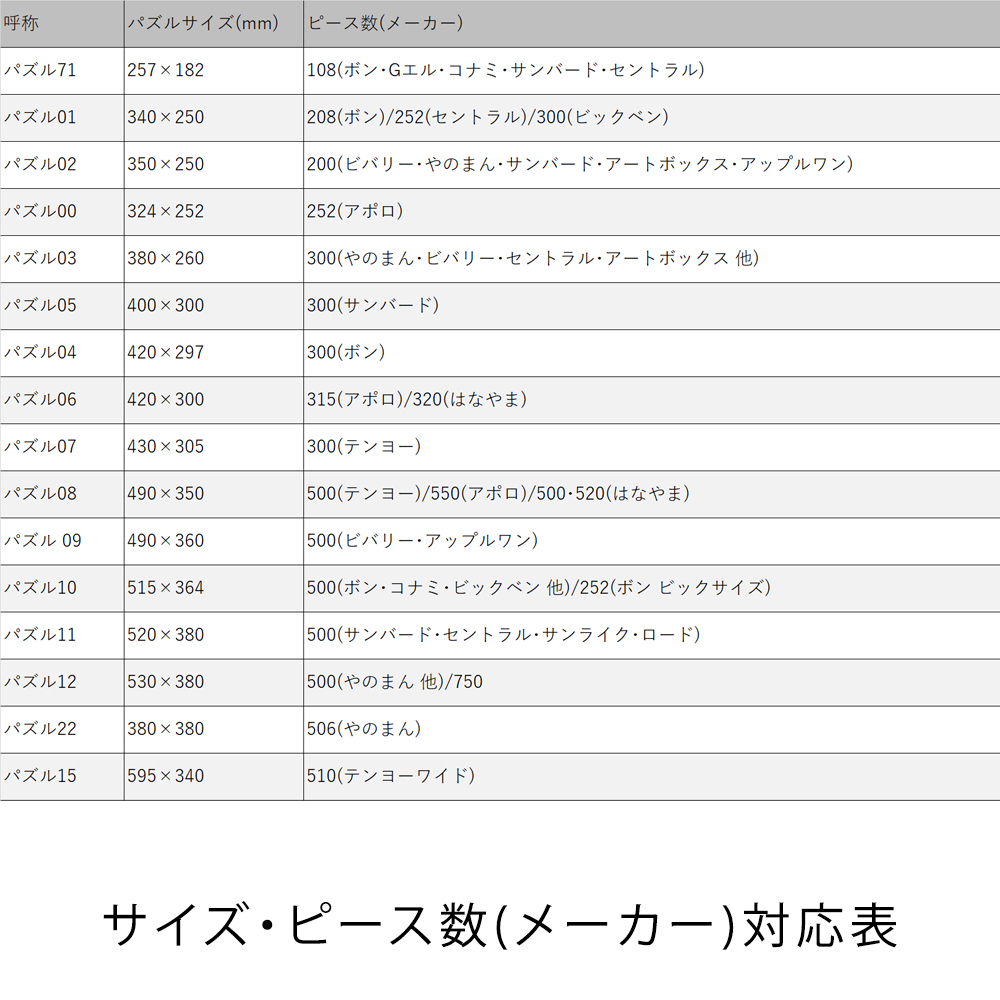 ジグソーパズルに使用できるアルミフレームです。パズルサイズ33サイズに対応しております。フレームを正面から開けることができるので、パズルを正面から額装することができます。サイズに関してはサイズ・ピース数(メーカー)対応表をご確認ください。
