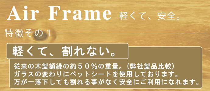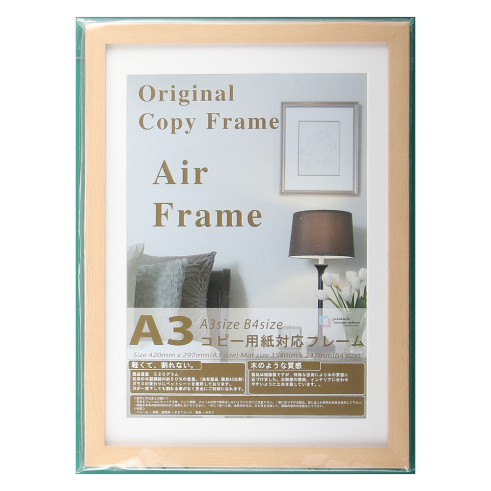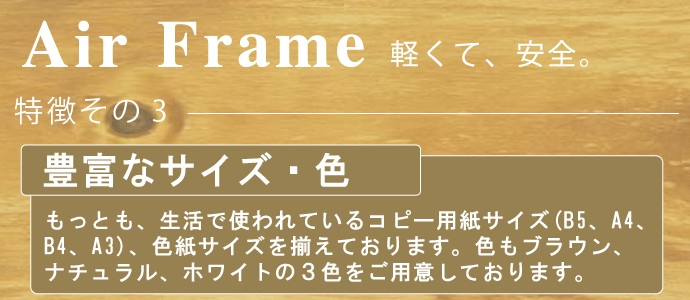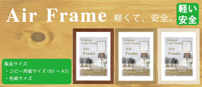 人気のAIRフレームの特別色となります。フレームの色は白木に近い色です。1?厚のマットが入っております。マットを使えば、コピー用紙B4サイズの作品が額装できます。マットを使わなければコピー用紙A3サイズの作品が額装できます。
