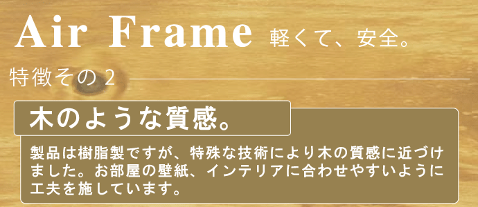 人気の理由は1「軽い」、2「割れない」3「木のような質感」です。ガラスの代わりに0.5mm厚のPET樹脂を使用しているので、非常に軽く、割れる恐れもありません。又、質感にもこだわり、樹脂製ですが、木の様な質感をだしております。。