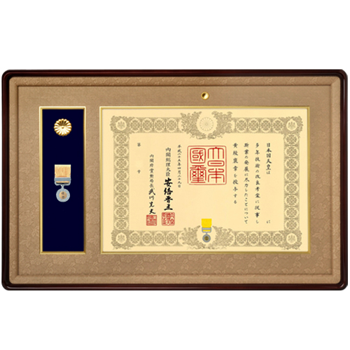 高級叙勲額になります。職人が1枚づつ生産をしていきます。色は木地(ブラウン)、チーク(ライトブラウン)、コーヒー(ダークブラウン)、黒(漆塗)の4色展開です。マットの色をご指定頂きご注文下さい。職人が1枚づつ生産させて頂きます。サイズは賞状用紙のサイズを確かめてご注文ください。