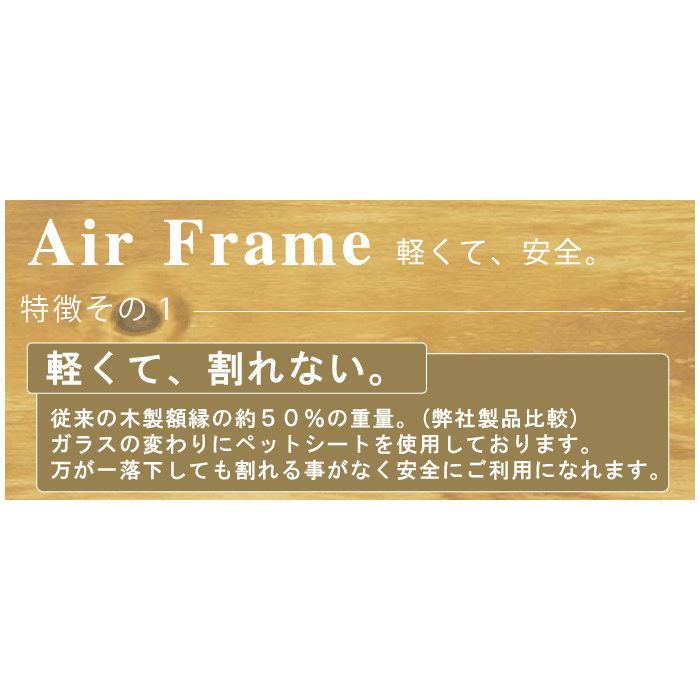 人気商品です。人気の理由は1「軽い」、2「割れない」3「木のような質感」です。ガラスの代わりに0.5mm厚のPET樹脂を使用しているので、非常に軽く、割れる恐れもありません。又、質感にもこだわり、樹脂製ですが、木の様な質感をだしております。色もホワイト、ナチュラル、ブラウンと3色、サイズもB5サイズ〜A3サイズ、色紙サイズをご用意しております。B5サイズ(A5 サイズ用マット)、A4サイズ(B5サイズ用マット)、B4サイズ(A4サイズ用マット)、A3サイズ(B4サイズ用マット)に0.5?厚マットが付属しています。