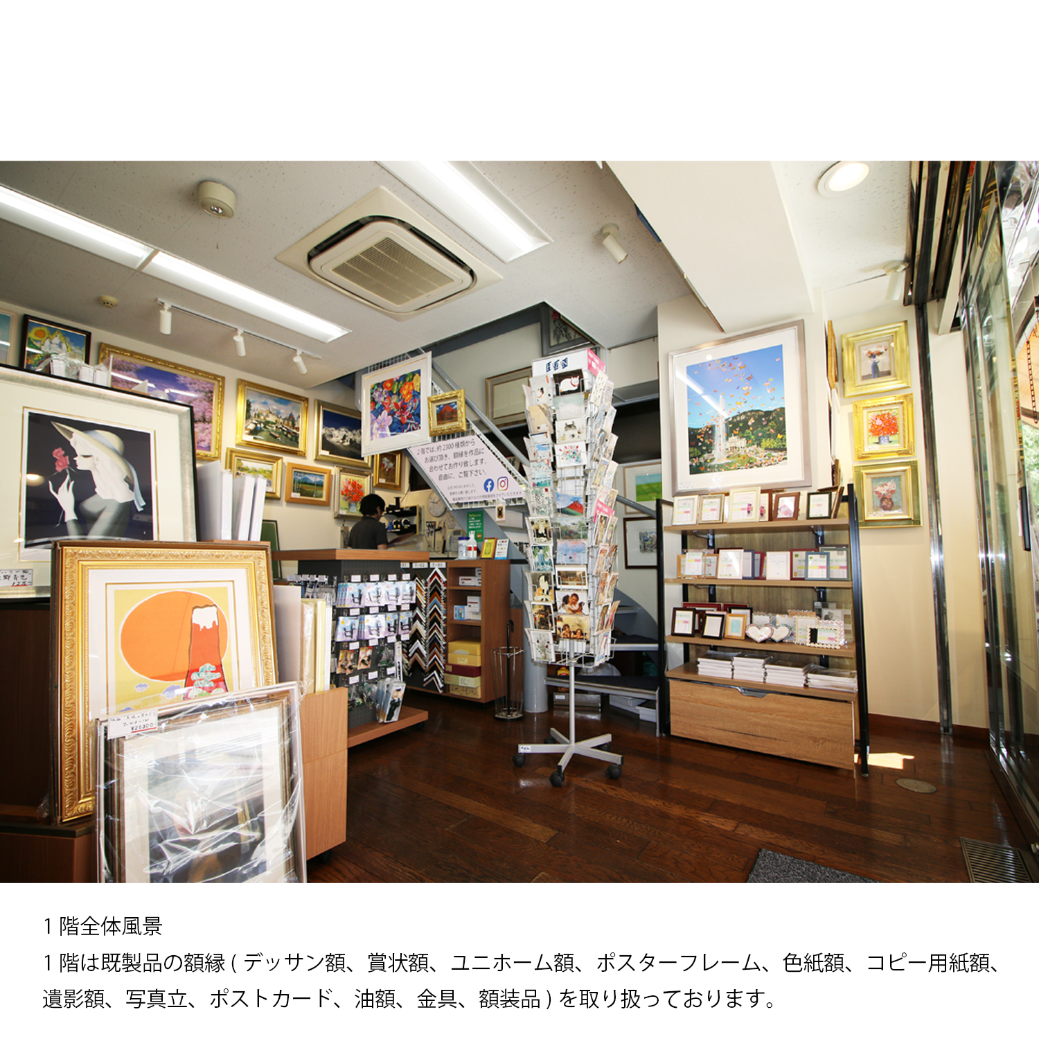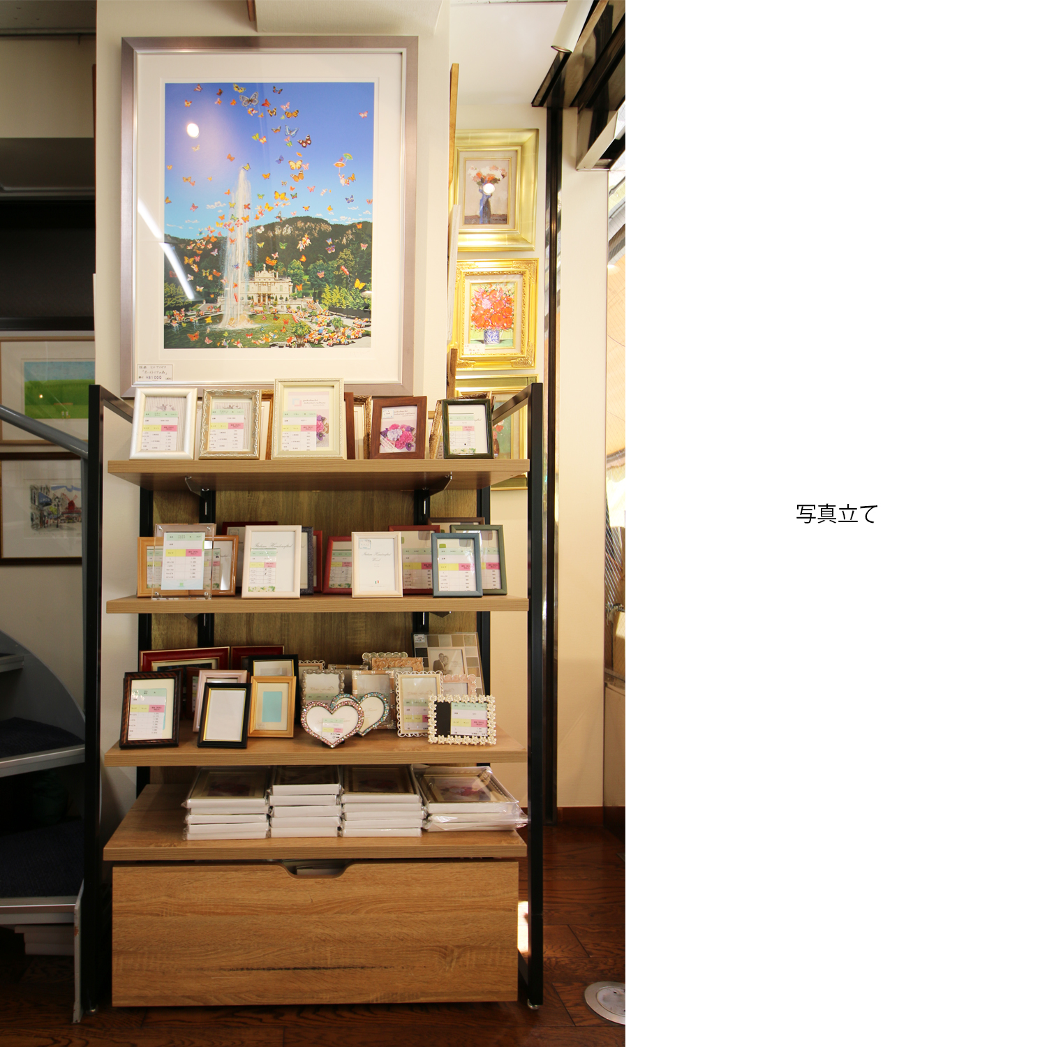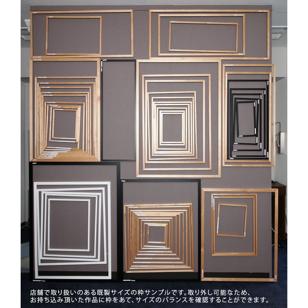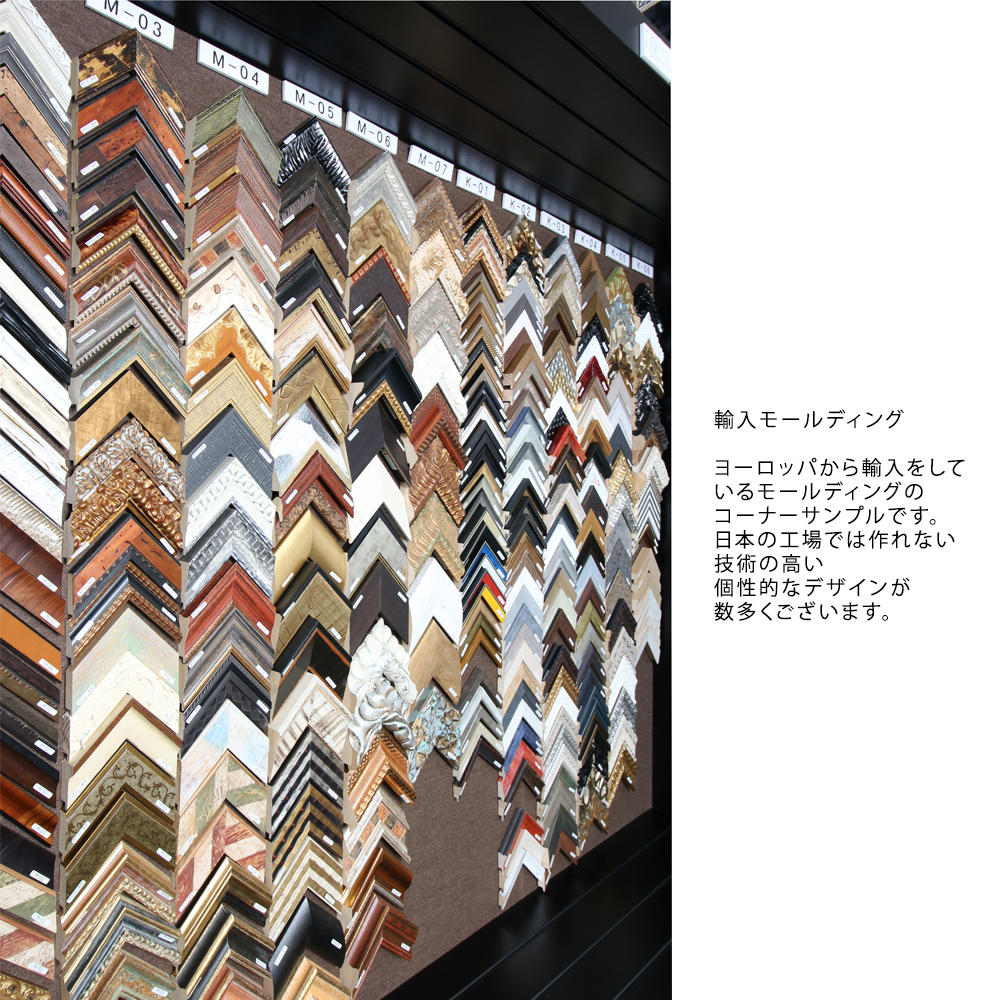 小売店舗では、額縁、額縁金具、絵画を取り扱っております。1階は賞状額、デッサン額、色紙額、油額等の規格サイズを扱い、2階はオーダーフレームを取り扱っております。ご案内としては、まずは1階の規格サイズでご提案させて頂き、ご希望に沿わない場合は2階でご案内させて頂いております。2階には国内外約2,300種類の額縁(モールディング)(国内最大規模の品揃えです。)を取り揃えております。その中からお客様の作品に合わせてオリジナルの額縁を1枚から生産させて頂きます。弊社オリジナルのモールディングを数多く扱っておりますので、比較的手頃な価格帯でオリジナル商品をご注文頂けます。額装技術も創業92年の実績から平面作品から立体作品、大型作品、様々な物を額装させて頂いております。社歴は古いですが、2020年5月に小売店舗を改装リニューアルいたしました。額装イメージを事前に確認できるように、デジタル技術を活用した時流に沿ったご提案もさせて頂いております。