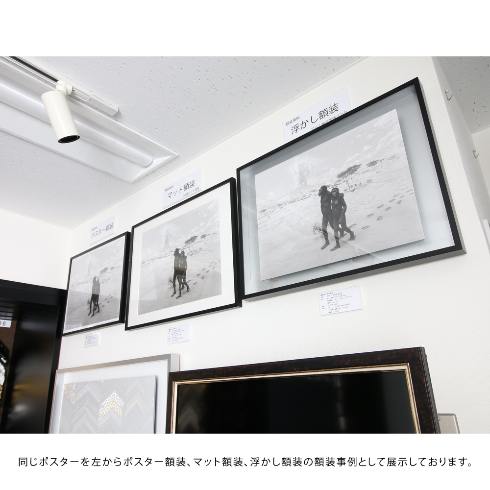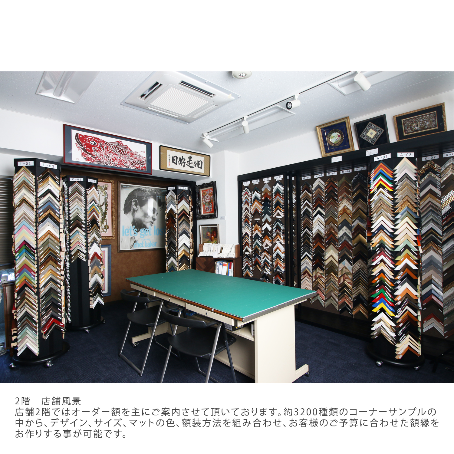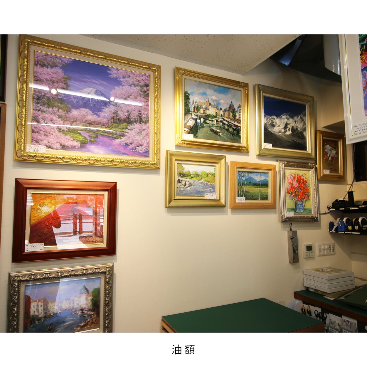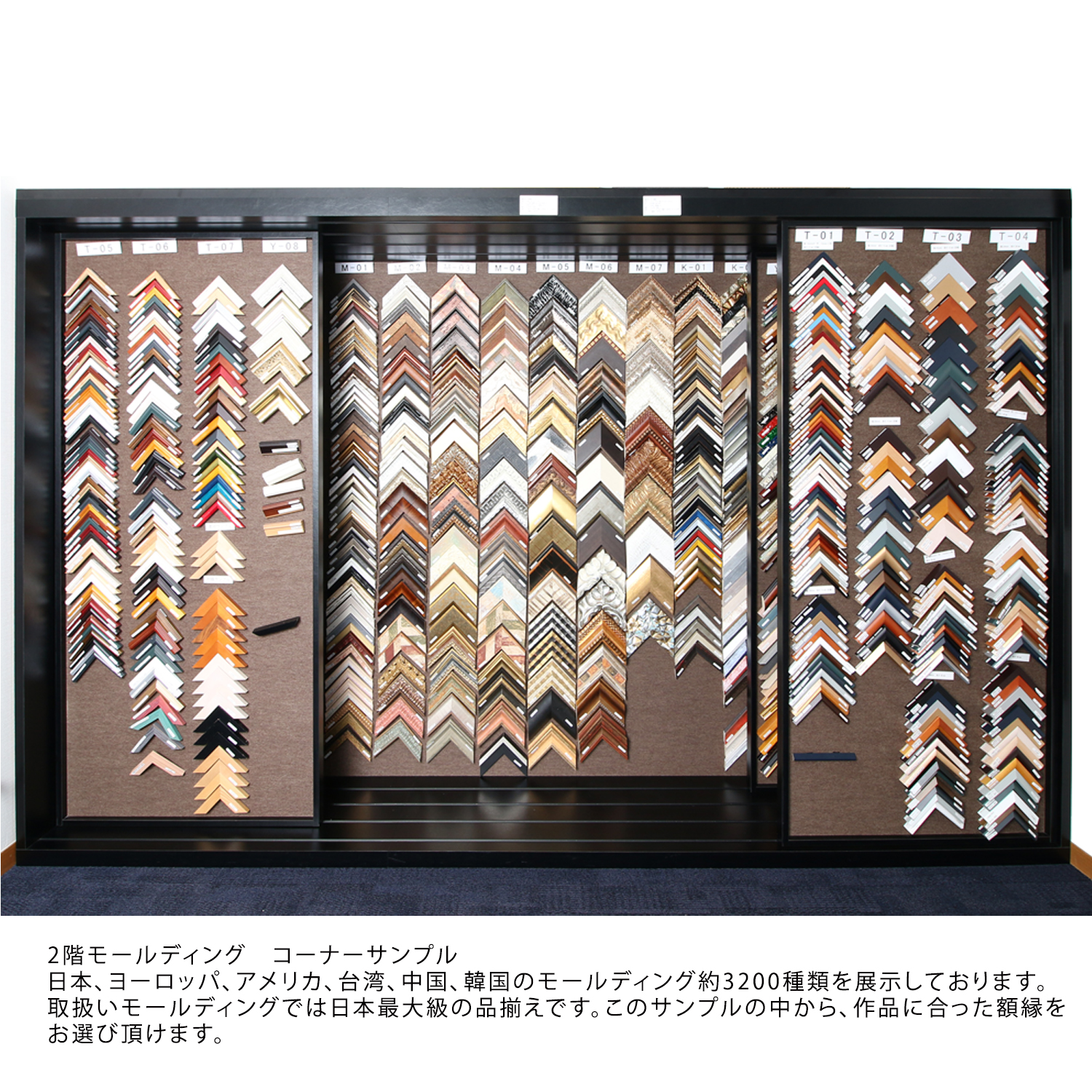 小売店舗では、額縁、額縁金具、絵画を取り扱っております。1階は賞状額、デッサン額、色紙額、油額等の規格サイズを扱い、2階はオーダーフレームを取り扱っております。ご案内としては、まずは1階の規格サイズでご提案させて頂き、ご希望に沿わない場合は2階でご案内させて頂いております。2階には国内外約2,300種類の額縁(モールディング)(国内最大規模の品揃えです。)を取り揃えております。その中からお客様の作品に合わせてオリジナルの額縁を1枚から生産させて頂きます。弊社オリジナルのモールディングを数多く扱っておりますので、比較的手頃な価格帯でオリジナル商品をご注文頂けます。額装技術も創業92年の実績から平面作品から立体作品、大型作品、様々な物を額装させて頂いております。社歴は古いですが、2020年5月に小売店舗を改装リニューアルいたしました。額装イメージを事前に確認できるように、デジタル技術を活用した時流に沿ったご提案もさせて頂いております。